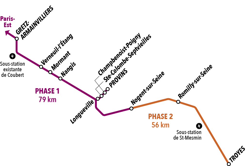Cette électrification se déroule en 2 phases. La première phase, de Gretz-Armainvilliers à Nogent-sur-Seine, s’achève (1er semestre 2022). Les travaux de la deuxième phase, entre Nogent-sur-Seine et Troyes, démarreront fin 2024 et s’achèveront début 2028.